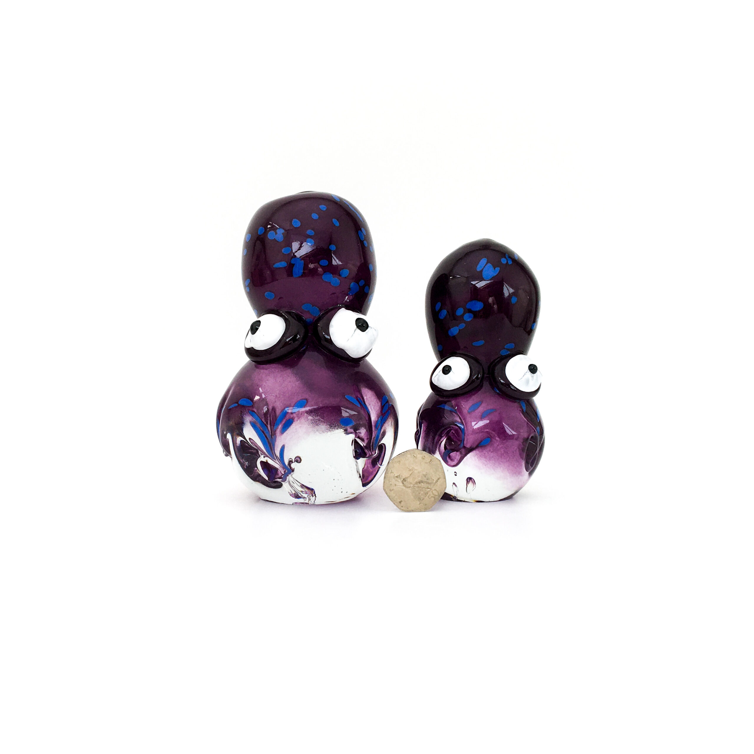 The first two perfectly purple octopi to swim out of the studio! I loved making them! I love the eyes, they are a little over the top, cartoony but they add so much character. Like life, I like my glass to be fun. Two sizes Mumma and baby, or poppa! Lovely together but can be bought separately. I will be making more next year but they’ll never be the same so if you like them, grab em!