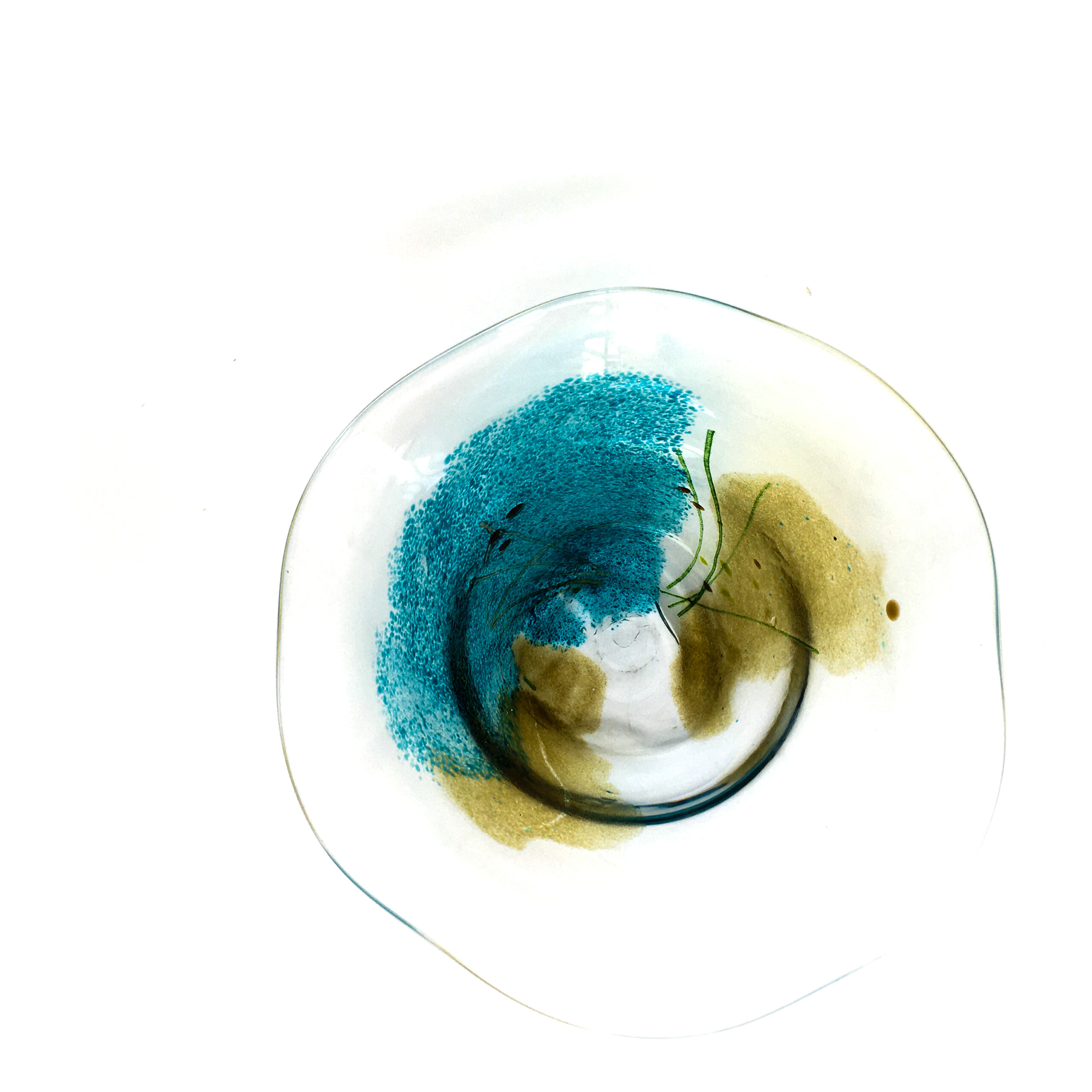 Another gorgeous Rock Pool bowl, with a very watery wavey edge!  24.5cm diameter across rim. A splash of aquamarine blue and sargasso green, coloured cain and frit create weeds and fish gently suspended in the thick gloopy crystal clear glass. As always, the pics don’t do it justice!  Photos are of actual piece, not stock.  Signed and dated. Ed Evans 2025