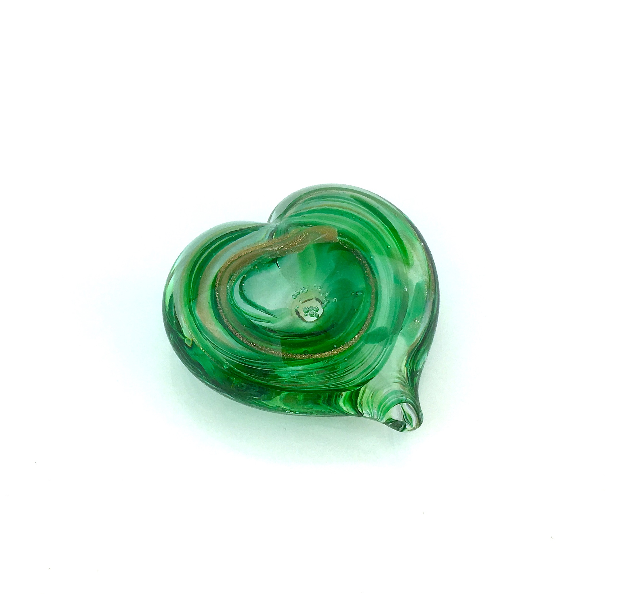 A solid glass heart, emerald green with a splash of glittering goldstone. A little reminder of your love, Just big enough to engrave a few words on. If you wish to personalise this perfect little present, please write your words for engraving in the comments box at the check out, 25 characters maximum.